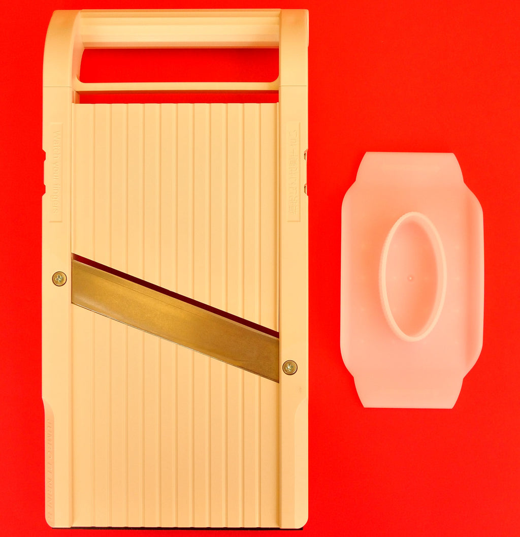 JUMBO BENRINER bandolim de 120 mm de largura.Você pode ajustar a espessura de corte entre 0,5 mm e 9 mm com um parafuso de ajuste.Largura de corte : 120 mmTamaño : 325 mm x 160 mm x 50 mmPeso : alrededor de 500 gramosHay otro modelo con 3 cuchillas julianas intercambiables. Hecho en Japón.