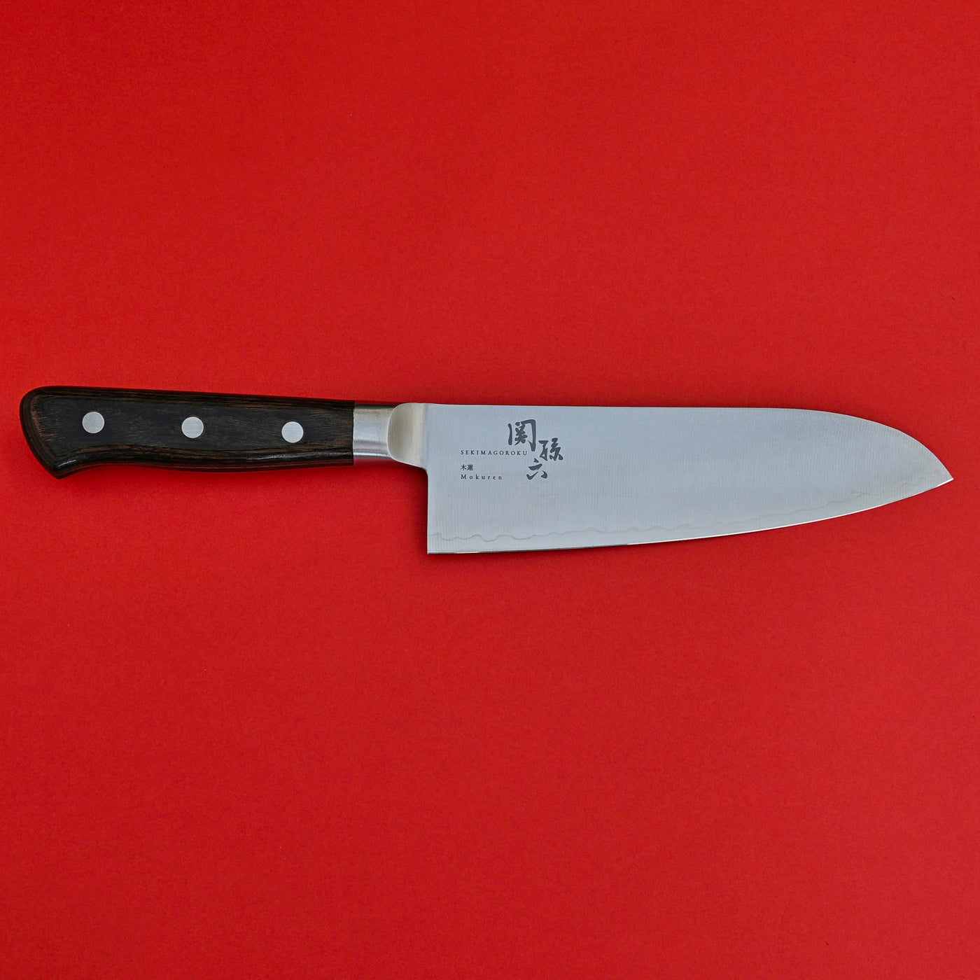 Kai Seki magoroku cuchillo del Chef 180 mm AE-5157 AE5157 Serie MOKUREN.Longitud de la hoja : 180 mmLongitud del mango : 120 mmPeso : 160 gramos Hoja : núcleo de acero al carbono + 2 capas de acero inoxidable alrededor, sólo 3 capas.Virola : acero inoxidable Mango : madera natural reforzadaUn cuchillo con dos filos, para las manos derecha e izqu...