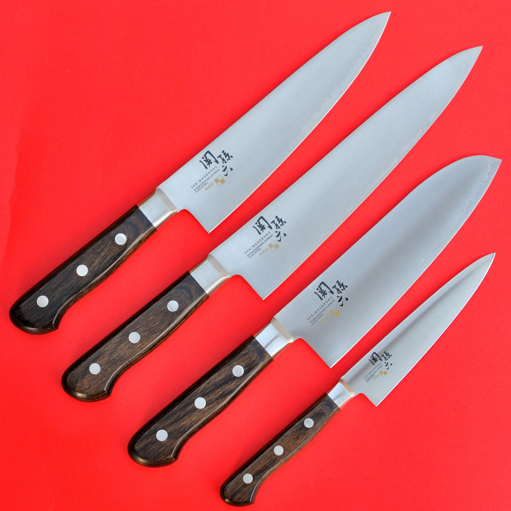 Kai Seki magoroku Conjunto de 4 facas Serie IMAYO com um belo padrão martelado. Lâmina : Molibdénio Vanádio de aço inoxidávelBotāo : Aço inoxidável Cabo : Madeira laminada reforçadaFaca do Chef AB5460 AN-5460 :Comprimento da lâmina : 210 mmComprimento do cabo : 120 mmPeso : 170 gramasFaca do Chef AB5459 AB-5459 :Comprimento da lâmina : 180 mmCo...